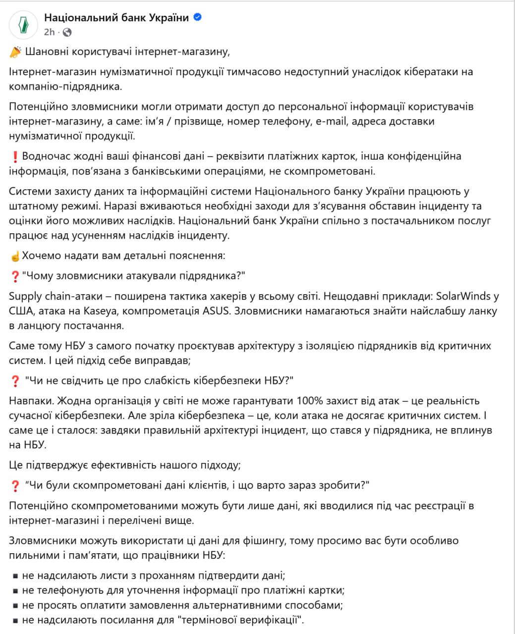 Національний банк України повідомив про кібератаку на компанію-підрядника, яка займалася розробкою та підтримкою інтернет-магазину нумізматичної продукції (coins.bank.gov.ua).