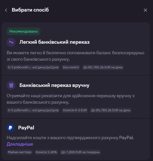 10. Потрібно внести 200 євро SEPA-переказом без комісії (ім'я на кого банк повинно співпадати з власником біржі), також можна поповнити через Paypal (2,4% комісія).